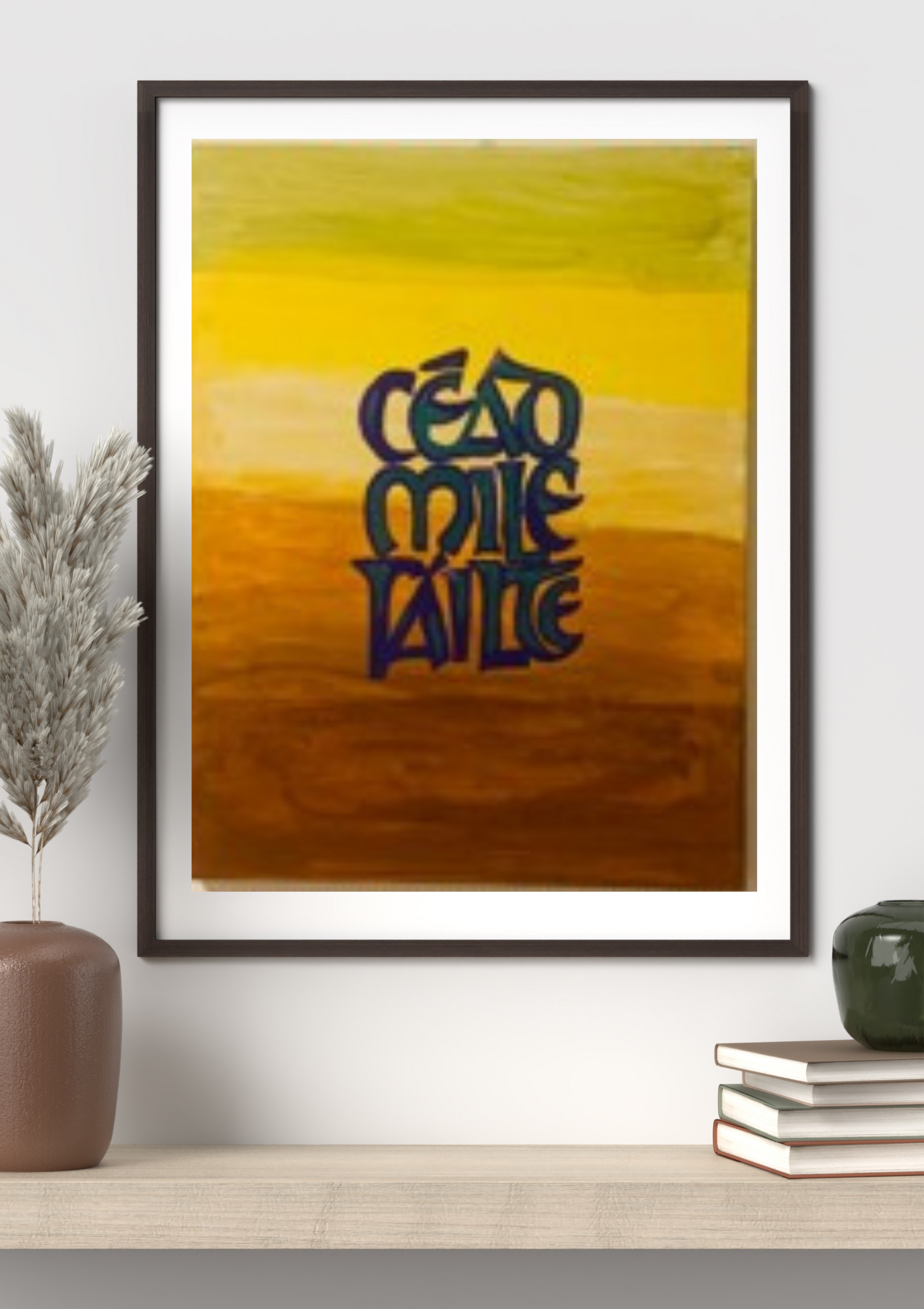This vibrant abstract composition radiates warmth and openness through a bold interplay of golden yellows, brown and calm greens. Fluid, sweeping brushstrokes intersect with radiating lines, creating a sense of movement that draws the viewer inward. At the centre, a gentle swirl of “’Hundred Million Welcome” suggests an embrace or a gathering space, inviting all who look upon it to feel at home. The abstract words, celebrates arrival while offering comfort. Altogether, the artwork captures the spirit of inclusion, hospitality, and joyful anticipation.