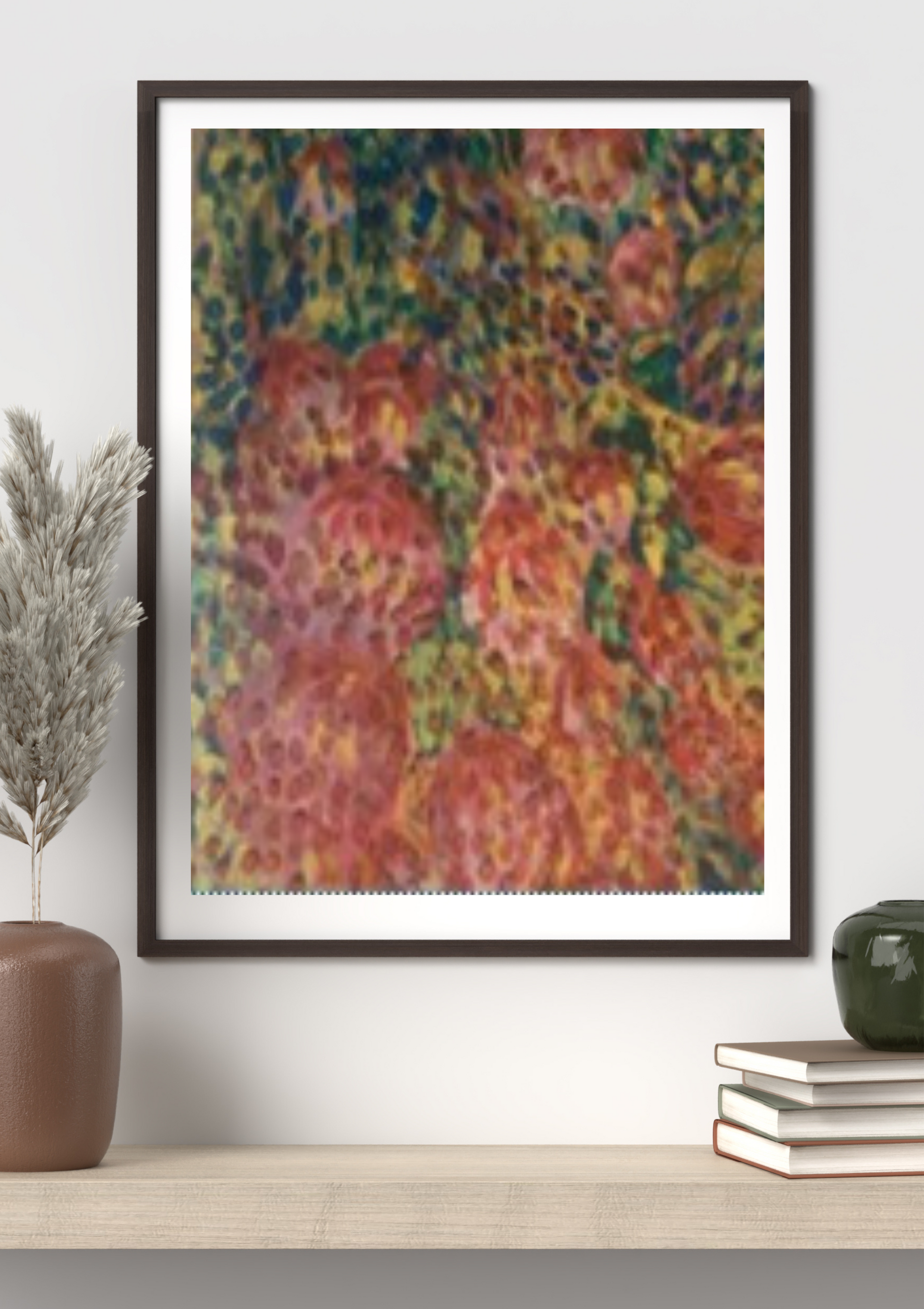 Imagine a vivid explosion of color and form, where flowers aren’t painted realistically but are instead suggested through bold, sweeping shapes and intricate patterns. Petals spiral out in bursts colors. some sharp like shards of glass, others soft and cloud-like. The palette is electric: magenta, tangerine, cobalt, emerald, and gold swirl and blend, bleeding into each other like watercolors.